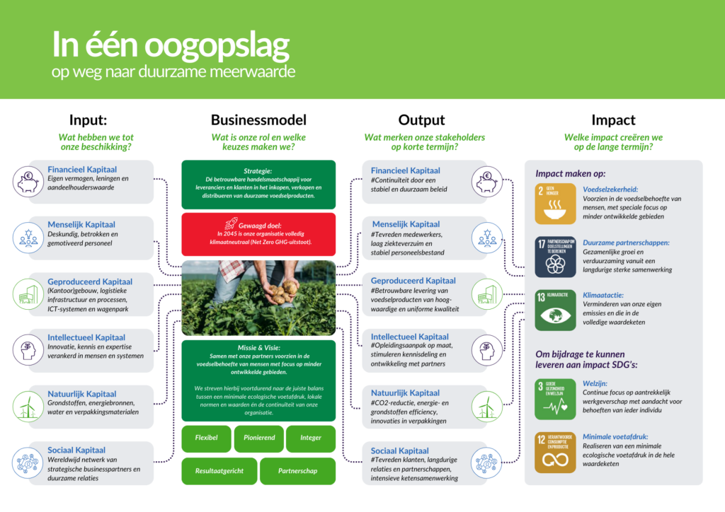 Vervolgens ontwikkelden we een integraal waardecreatiemodel. Dit model laat zien welke kapitalen JPB inzet (input), hoe deze worden omgezet in producten en diensten (throughput) en welke waarde er vervolgens ontstaat voor stakeholders en samenleving (output & outcome)